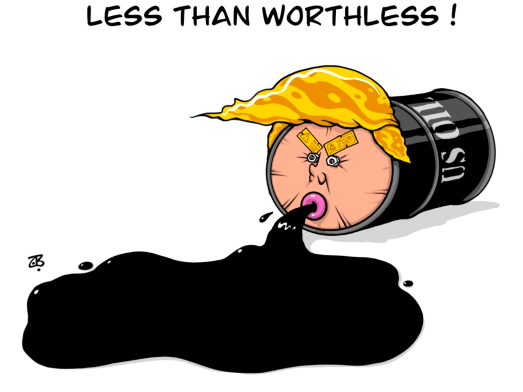 This photo is an image of Trump on a barrel of oil, spitting it out with the heading “less than worthless”. This is in reference to the oil prices dropping below zero on 4/20/2020, and a barrel of crude oil was worth around -$30.00. This is due to two reasons: the Saudi Arabia and Russia price war, and the decreased use of oil due to COVID 19. The Saudi Arabia and Russia price war dropped oil prices because Saudi Arabia, a major foreign oil producer, attempted to punish Russia because Russia refused to decrease oil production. Because of the coronavirus and the lockdown we are currently under, people are not driving places as there are not many places you could physically drive to. Due to this disagreement and simple supply and demand, oil has been severely devalued over the recent weeks.